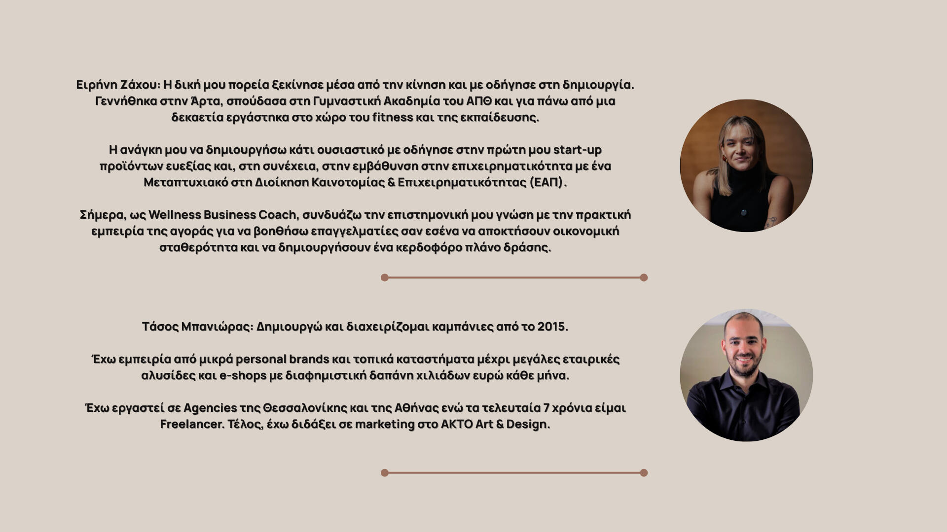 Η δική μου πορεία ξεκίνησε μέσα από την κίνηση και με οδήγησε στη δημιουργία.Γεννήθηκα στην Άρτα και ζω στη Θεσσαλονίκη, όπου σπούδασα στη Γυμναστική Ακαδημία του ΑΠΘ.